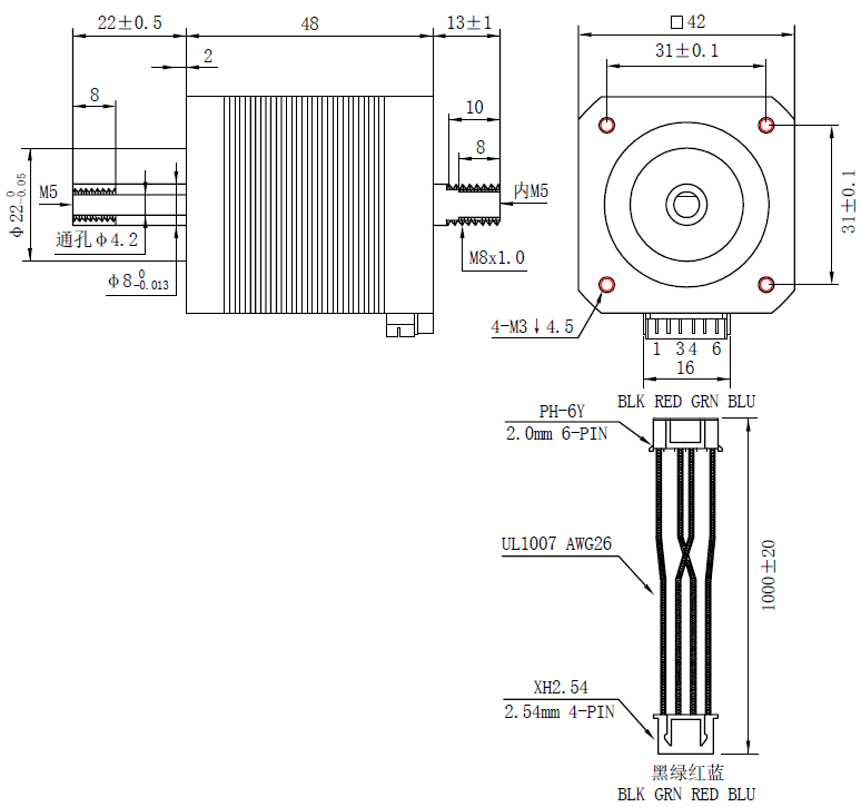 NEMA 17 Hollow Shaft M8 Thread: This compact size 42mm NEMA 17 hollow shaft stepper motor has a body length 48mm with 1.68A rated current & holding torque 0.55Nm. A hollow shaft with outer diameter Φ8mm & inner diameter Φ4.2mm is available and also a dual shaft with front shaft length 22mm & rear shaft length 13mm with M8 thread is designed.